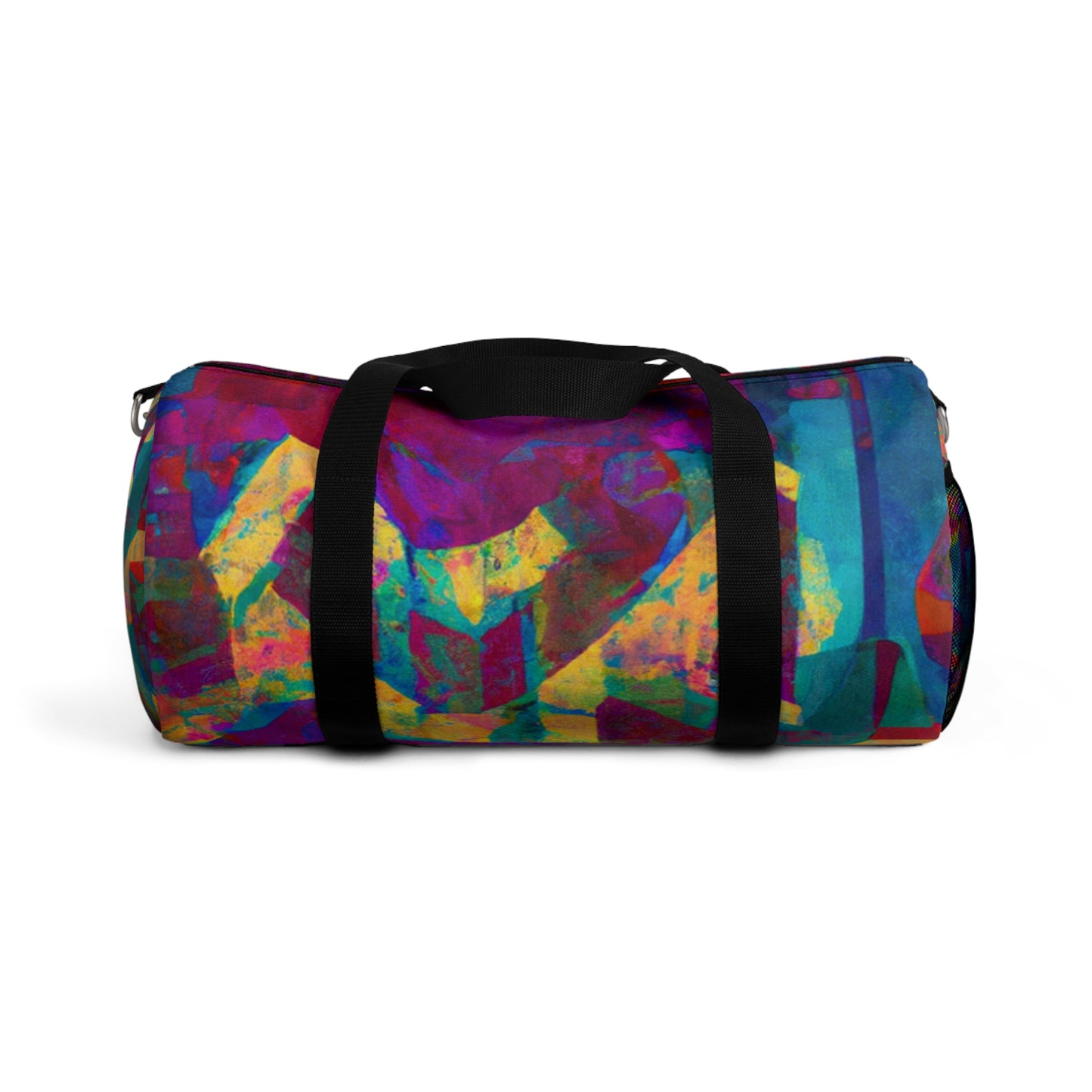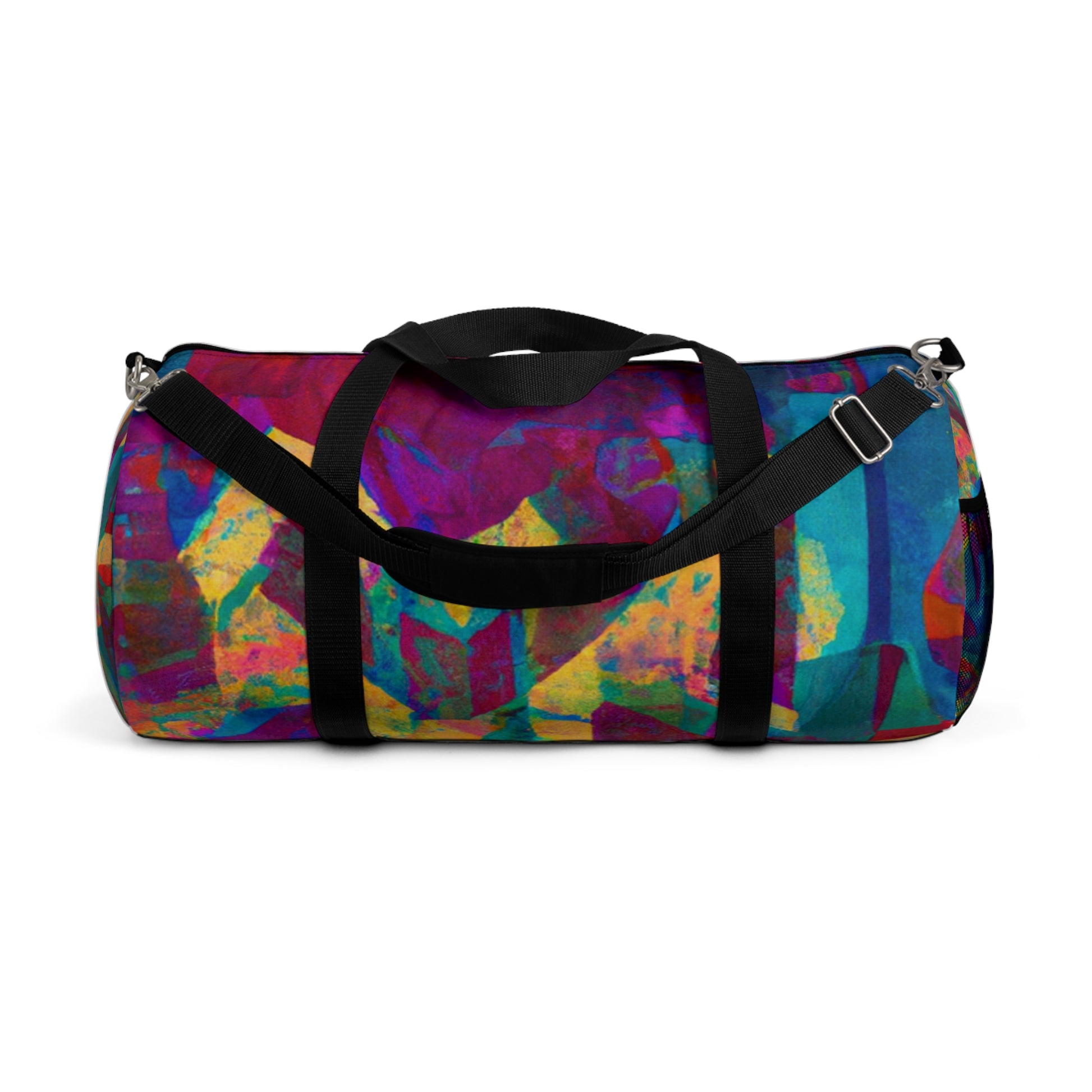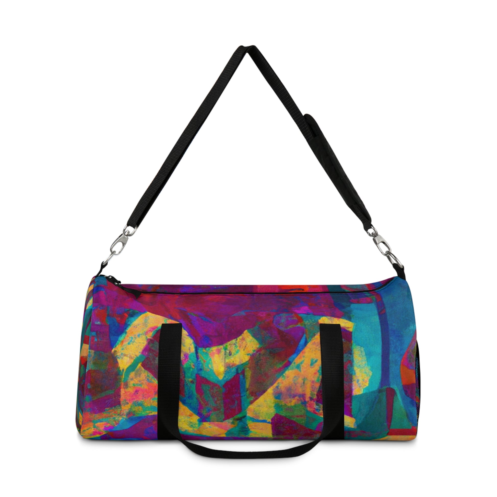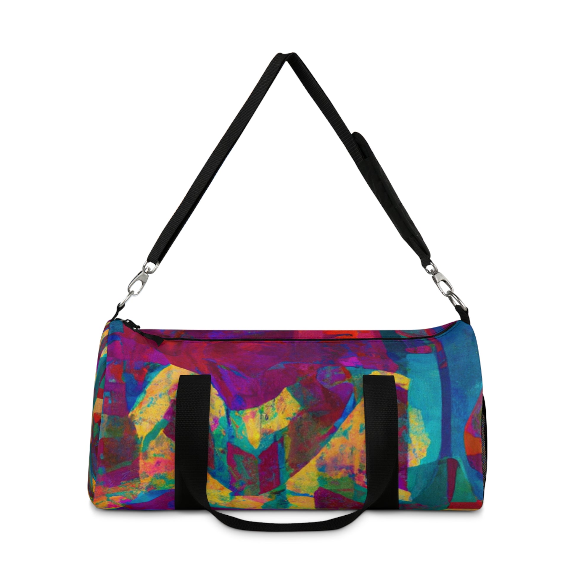 This duffel bag is perfect for art lovers! It has a unique abstract geometric pattern with cool colors to give your look an edge. Great for storing art supplies, it has a detachable shoulder strap and plenty of pockets for easy access to all your belongings. Whether heading out or staying in, this bag will have you looking stylish and modern. #duffelbag #artlovers #abstractpattern #geometric #coolcolors #digitaldesign #storage #shoulderstrap #modernstyle #easyaccess #functionalfashion