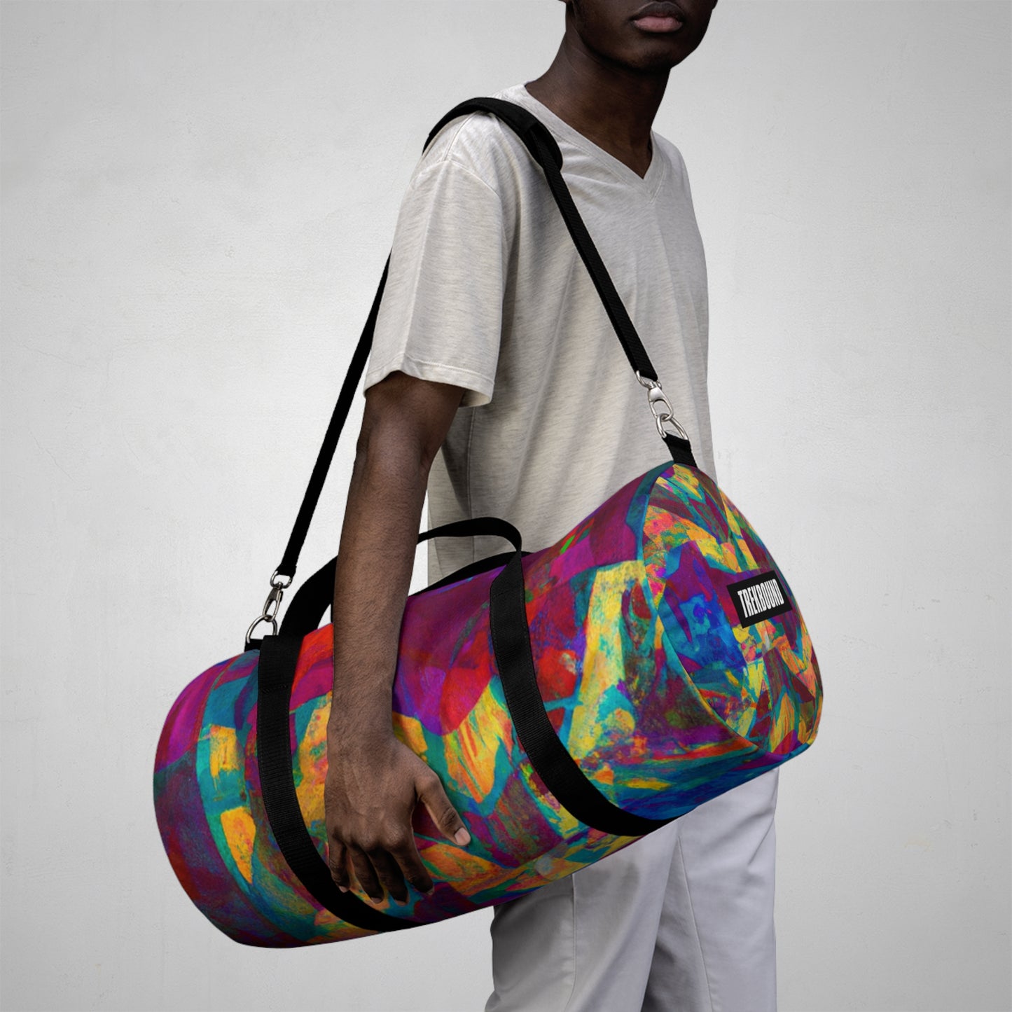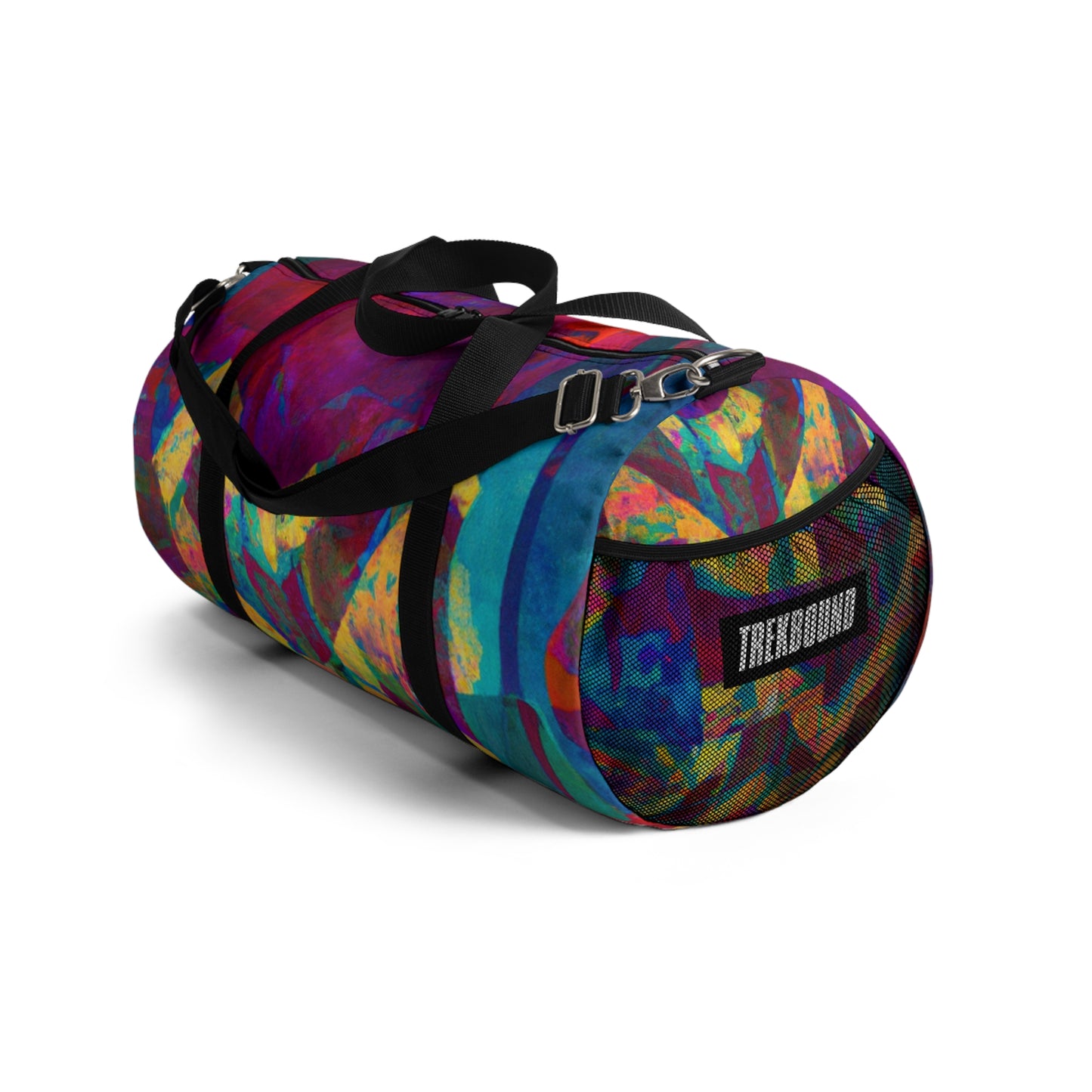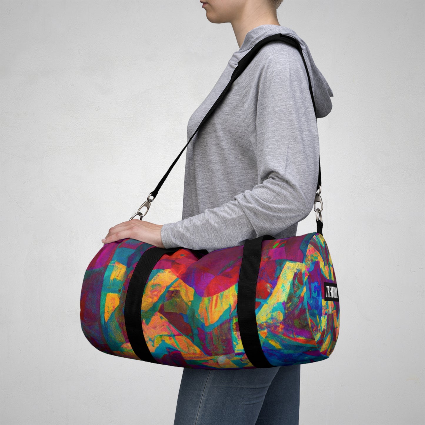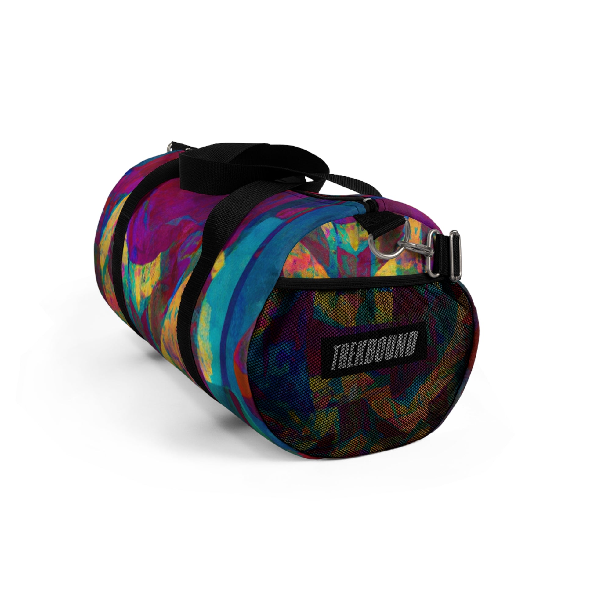 This duffel bag is perfect for art lovers! It has a unique abstract geometric pattern with cool colors to give your look an edge. Great for storing art supplies, it has a detachable shoulder strap and plenty of pockets for easy access to all your belongings. Whether heading out or staying in, this bag will have you looking stylish and modern. #duffelbag #artlovers #abstractpattern #geometric #coolcolors #digitaldesign #storage #shoulderstrap #modernstyle #easyaccess #functionalfashion