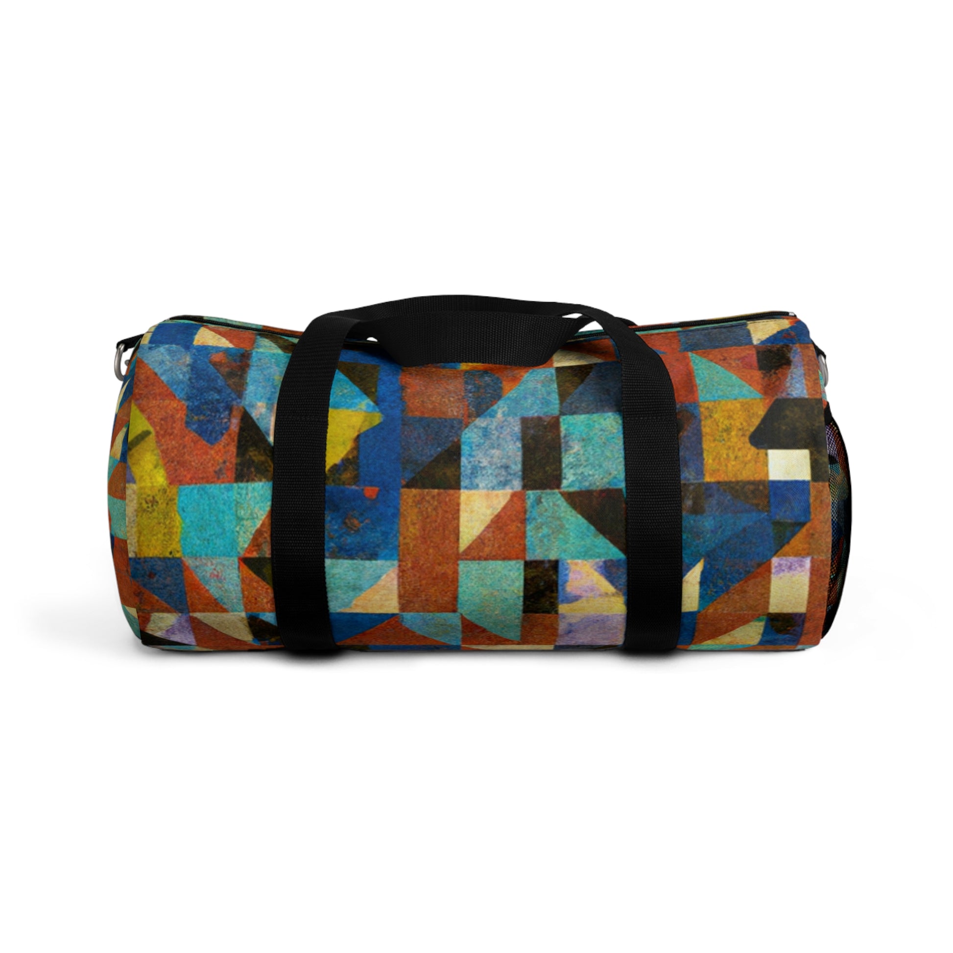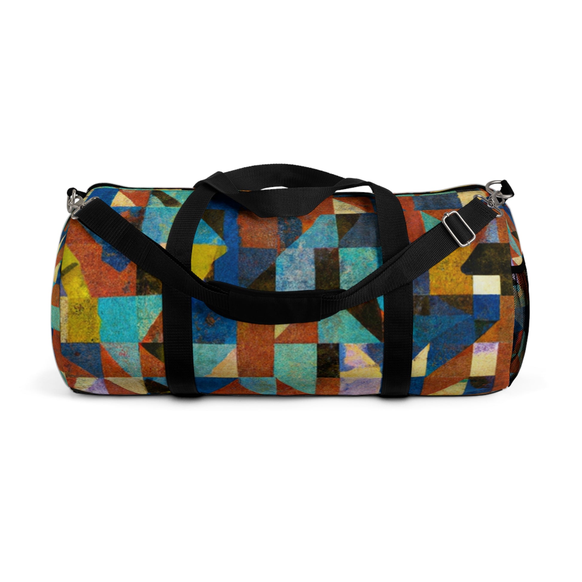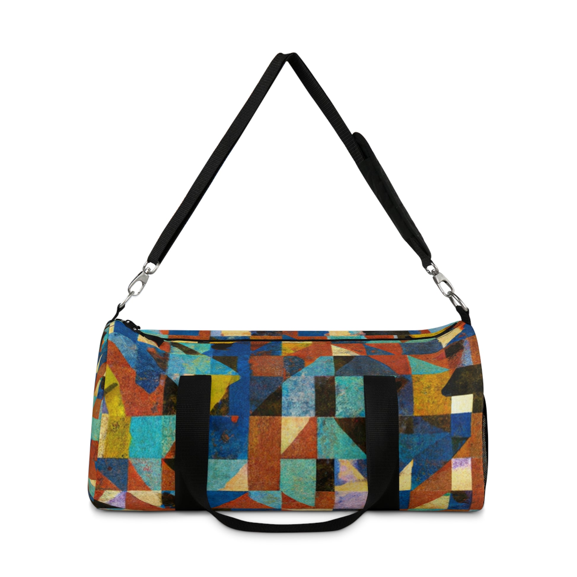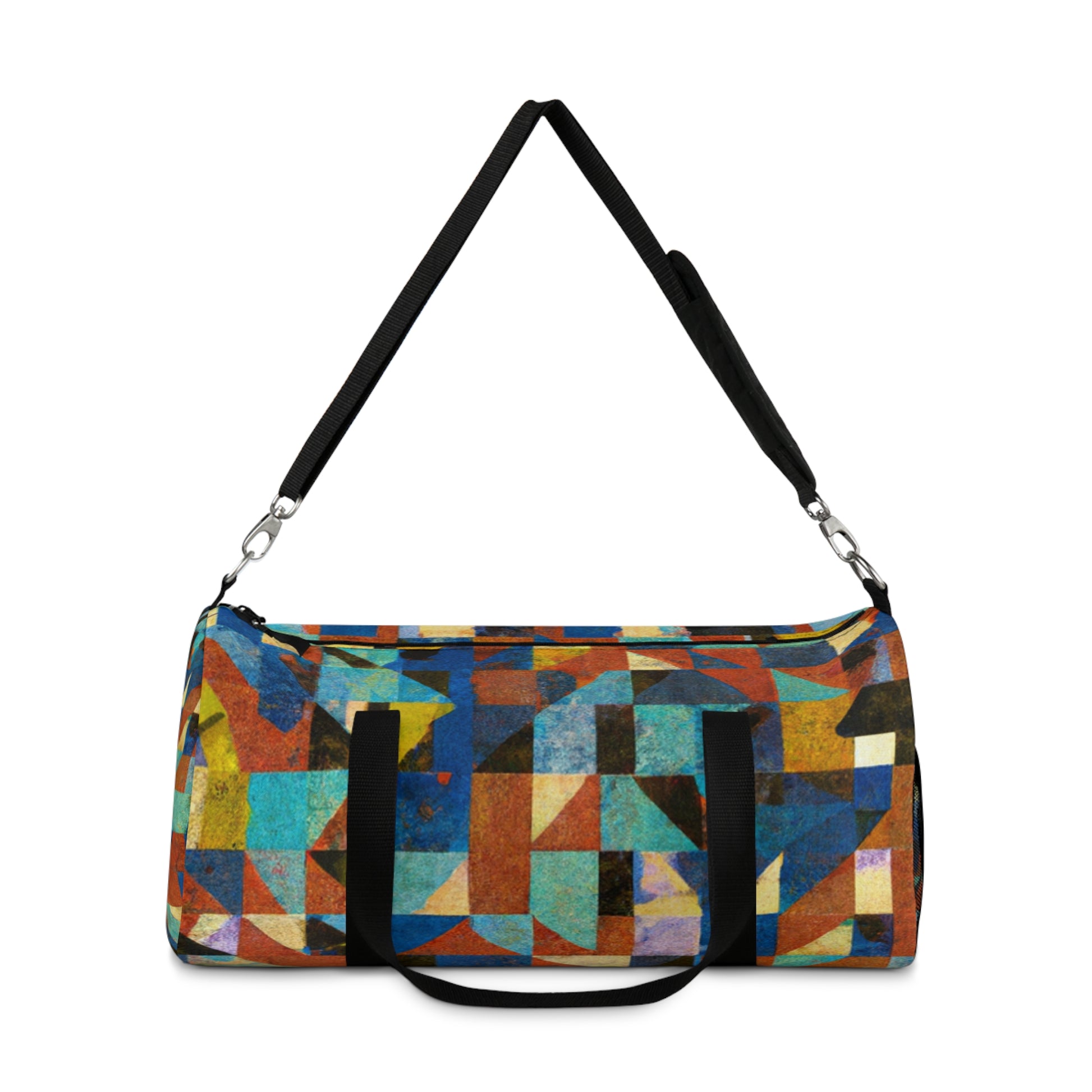 This abstract geometric duffel bag has cool colors perfect for digital art designs. It is made from durable yet light weight materials, with a sleek and modern design that helps make every trip perfect. It has a roomy interior that easily packs clothes and accessories and a secure zip closure to keep items safe. It's an impressive and practical accessory that you'll be proud to carry. #AbstractGeometric #DigitalArt #TexturedPattern #CoolColors #ModernDesign #DurableBag #TravellingEssentials #SecureClosure #RoomyInterior #StylishAndPractical #LightweightAccessories